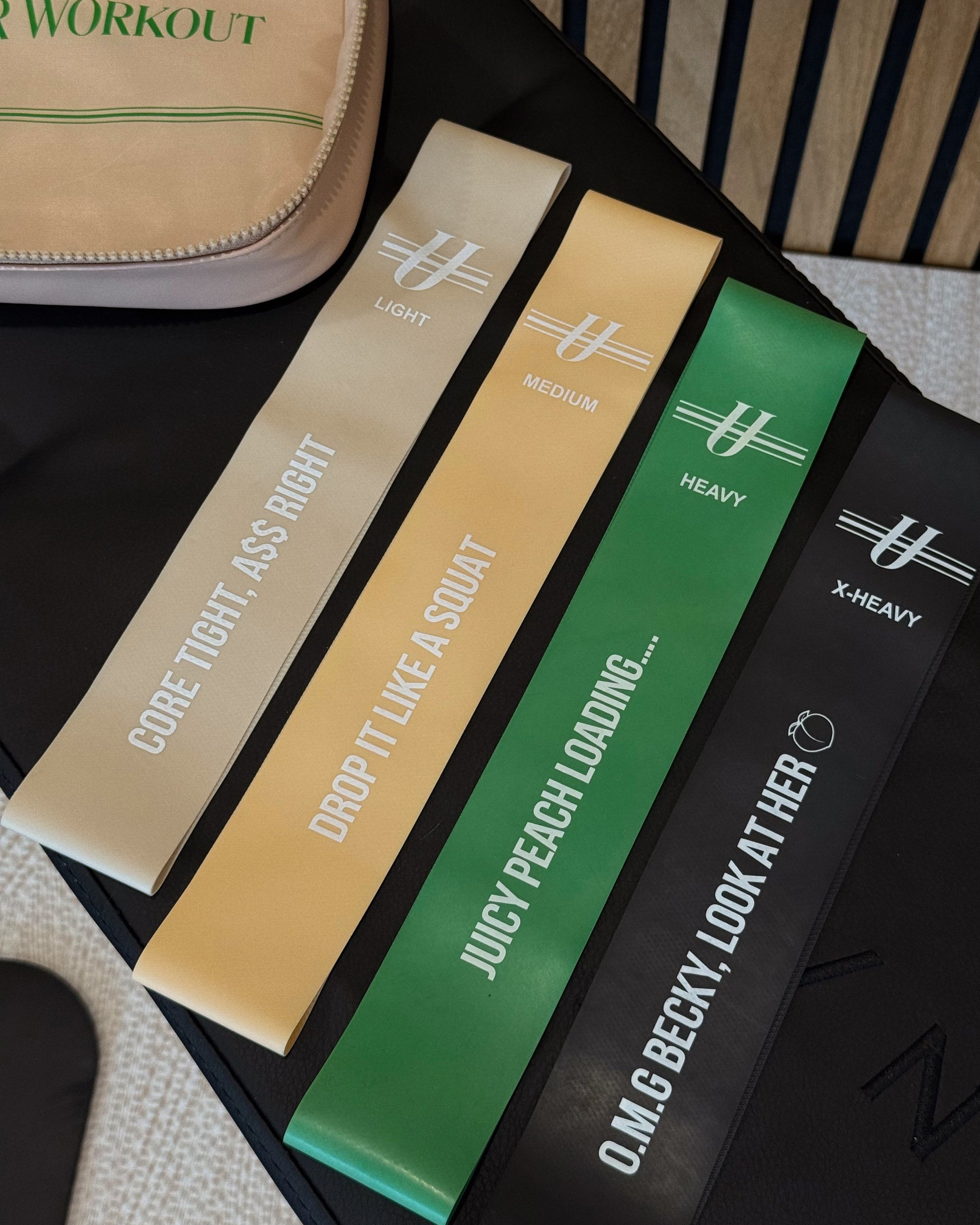 With four levels of resistance (light to extra heavy), these bands let you tailor your workout to your strength and mood. Made from durable latex with a smooth, grippy finish, they stay in place while you move. Each band features a cheeky phrase to match your vibe—because we believe in training with intention and personality.